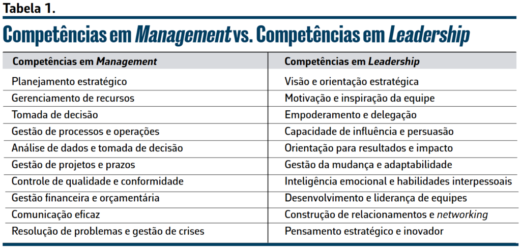 No contexto organizacional, é fundamental compreender as diferenças entre o papel do gerente e o do líder, na medida em que cada um envolve a mobilização de conjuntos distintos de competências. O exercício da gestão requer a capacidade de gerenciar processos, recursos e pessoas para atingir metas e resultados orga-nizacionais imediatos. Por outro lado, a liderança concentra-se em inspirar, engajar e influenciar os membros das equipes, promovendo uma visão compartilhada e impulsionando a inovação e o crescimento6.Esse primeiro grupo de competências está diretamente associado à instância do management. Isso inclui conhecimentos técnicos e operacionais específicos da área de atuação, habilidades de planejamento e or-ganização, capacidade de tomar decisões que operacionalizem a estratégia delineada e gerenciar recursos, inclusive humanos, de modo eficiente. O gerente deve ser capaz de implementar políticas e procedimentos, garantindo a eficácia dos processos e a obtenção dos resultados desejados7.Por outro lado, o exercício da liderança envolve um grupo de competências associadas ao registro da leadership. Além do conhecimento técnico, o líder necessita desenvolver habilidades interpessoais sólidas, como comunicação eficaz, capacidade de inspirar e motivar os membros da equipe, construção de relacio-namentos e gestão de conflitos. O líder também deve ser capaz de estabelecer uma visão clara e envolvente, definir metas desafiadoras e orientar a equipe em direção a esses objetivos, promovendo a colaboração e o desenvolvimento individual dos membros8.É importante destacar que o gestor mobiliza ambos os grupos de competências. Sua efetividade con-siste exatamente na ambidestria, na capacidade de impulsionar essas duas dimensões de competências. Enquanto, na “posição” de gerente assegura a eficiência e o controle operacional, na “posição” de exercício da liderança cria um ambiente propício à inovação, à adaptação e ao crescimento. Uma abordagem equi-librada, integrando as competências orientadas tanto ao management quanto à liderança, é cada vez mais essencial para o desempenho organizacional9.Dessa forma, os gestores devem reconhecer a importância de desenvolver e aprimorar tanto competên-cias gerenciais quanto de liderança. A busca por conhecimento, o desenvolvimento de habilidades inter-pessoais e a reflexão contínua sobre as atitudes e comportamentos são fundamentais para tornar-se um profissional da gestão, capaz de enfrentar os desafios complexos e em constante evolução do mundo organi-zacional. A Tabela 1 apresenta uma síntese das principais competências requeridas tanto em managementquanto em leadership.