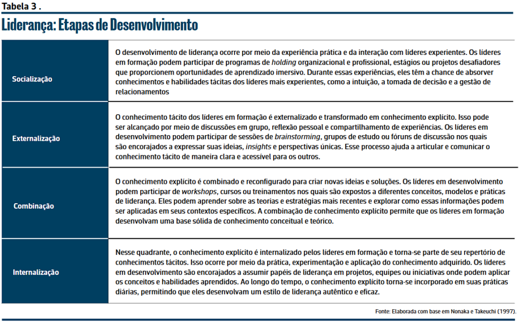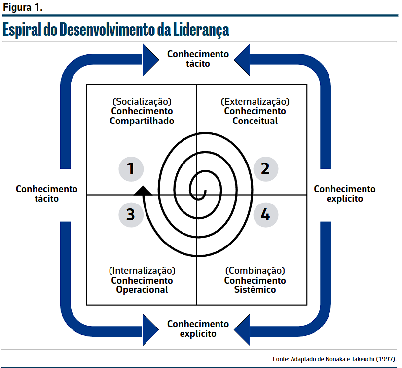 Mas, afinal, como desenvolver competências em liderança? Programas contemporâneos de capacitação têm buscado adotar abordagens mais sistêmicas e inovadoras, em consonância com a espiral de desenvol-vimento de conhecimento proposta pelos professores da Universidade de Tóquio Ikujiro Nonaka e Hirotaka Takeuchi12. Tal perspectiva tem sido particularmente relevante em ambientes que requerem lideranças ca-pazes não apenas de gerir as operações, mas também de inovar e se adaptar continuamente aos desafios dos negócios. Assim, para além das competências gerenciais tradicionais e habilidades de liderança focadas na Tabela 2, a abordagem de desenvolvimento de Nonaka e Takeuchi revela-se significativa para a identificação, desenvolvimento e retenção de estilos de liderança mais dinâmicos, integrados e orientados à cocriação de conhecimento e à inovação, por meio de atividades que percorrem quatro etapas – socialização, externalização, combinação e internalização do conhecimento, conforme mostra a Tabela 3.Por meio da abordagem, pode-se fomentar uma espiral contínua de desenvolvimento da liderança, for-necendo oportunidades estruturadas para cocriação coletiva e colaborativa de conhecimento. A Figura 1 apresenta essa dinâmica, em um espaço transicional, chamado por Nonaka e Takeushi de “Ba”, que combi-na a articulação de conhecimento tácito e explícito nas quatro etapas apresentadas.